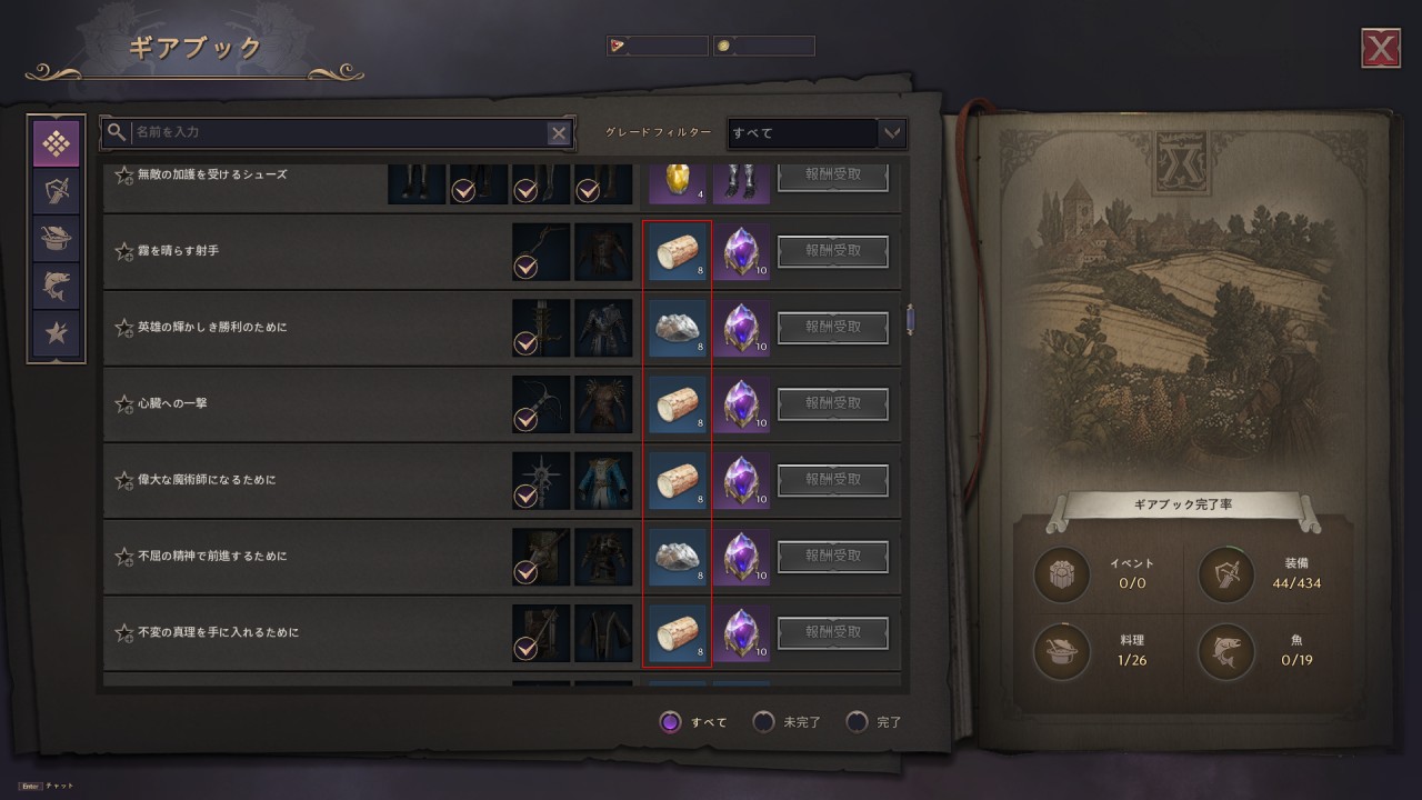 高級家具を製作するのに必要なレア素材の「希少な○○」を獲得するのには、キャラクター採集レベルが10以上で、採集地域のレベルが4または10の地域で採集すると稀に「希少な〇〇」を獲得できますが、非常に獲得が困難です。他に数量には制限がありますが、ギアブックの報酬としても獲得できます。下記画面ですと、レア防具を獲得してギアブックを完成させればそこそこの「希少な〇〇」が獲得可能です。